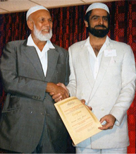 (Photo: Muhammad Shaikh receiving certificate from Sheikh Ahmed Deedat. Location: IPCI. Durban, South Africa.)